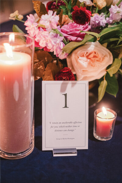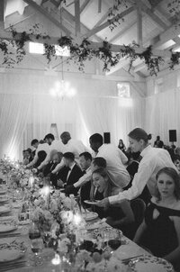 The Glenmere Mansion reception barn was transformed into a warm and inviting event space that exuded intimacy and was filled with romantic ambience. We achieved this by adding artfully swagged draping to soften the aesthetic and section off the room into separate dining and dancing areas, each with their own unique style thanks to lighting tones and decor selections. This worked beautifully for the smaller guest count and added to the guest anticipation of the next experience of the evening as they moved in to the dancing area.