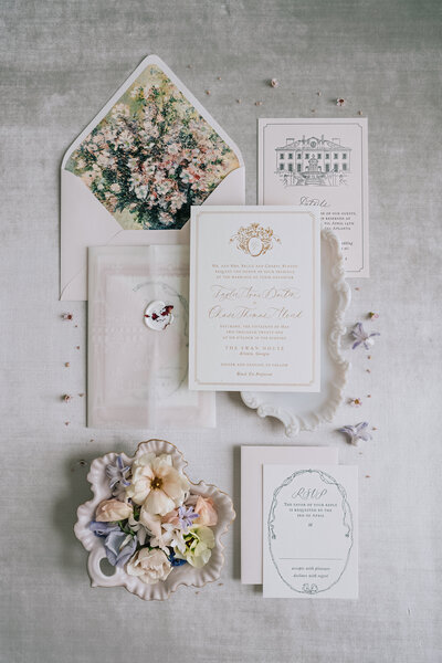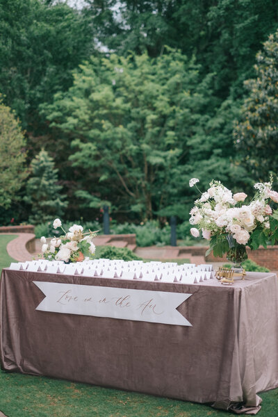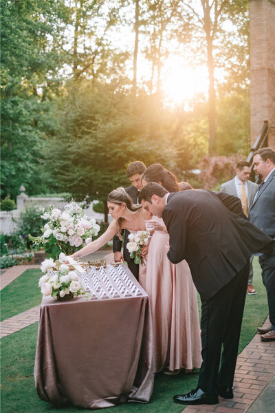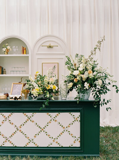 The Ritz-Carlton Lake Oconee ballroom was reimagined as a relaxed garden-inspired reception space that embodies the natural elegance of the lakeside setting. We brought in custom built bars that were fitted with whimsical floral inserts which coordinated with the invitation design and cohesively blended with the floral touches on the custom printed dance floor. Seating chart structures were fabricated to enhance the guest arrival experience and linens were custom made and curated to effortlessly harmonize with the design.