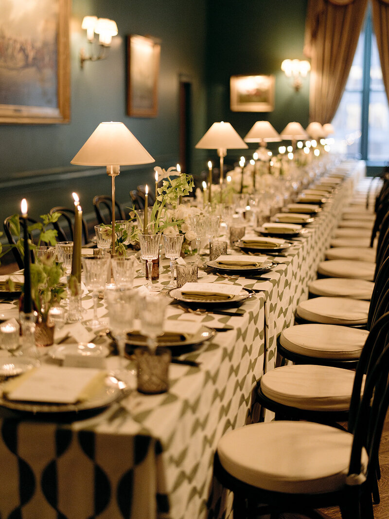 The cocktail space within the library was decorated with custom William Morris patterned chartreuse cocktail linens topped with petite bistro lamps to infuse a moody intimate club feel. Guests enjoyed vinyl DJ mixes of some favorite classics to get the party started.
