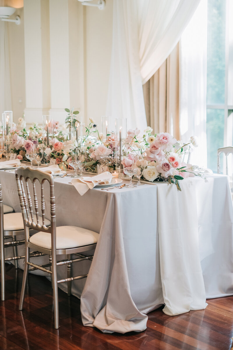 The reception ballroom design was heavily inspired by the couple’s engagement trip to Paris. Dining tables included a combination of creamy baroque patterned linens and pale grey silk shantung linens which were paired with champagne Versailles chairs. The tables were framed by substantial cherry-blossom style trees to bring a garden feel into the ballroom setting.