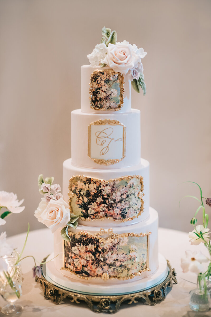 The invitation suite included a beautiful Monet floral painting within the design and the same painting was incorporated into the wedding cake design along with gilded detailing. The wedding cake was served alongside a Marie Antoinette inspired dessert display with a variety of Parisian sweets that guests could enjoy throughout the evening.