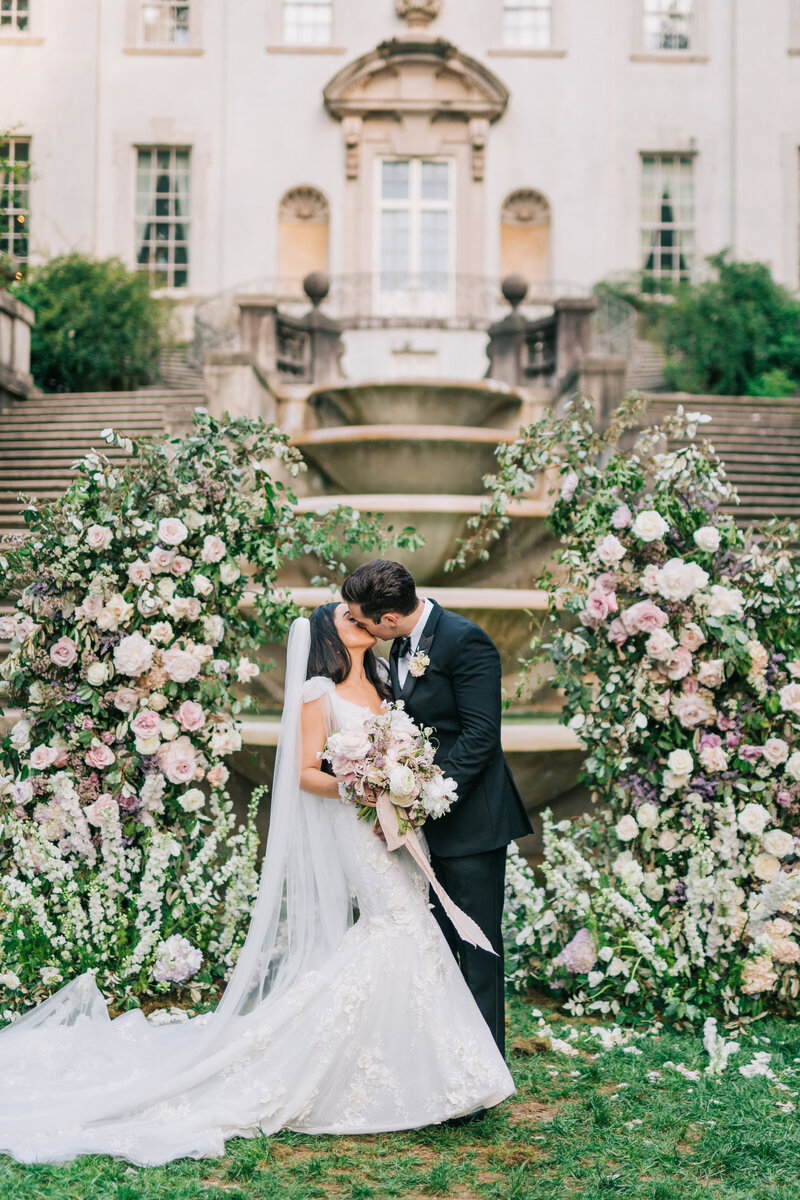 The Swan House is a one-of-a-kind venue with its stunning stone architecture, which served as the perfect setting for this Parisian inspired celebration. Guests arrived at the ceremony on the fountain lawn where a string quartet played contemporary classical music. The ceremony altar featured a lush semi-arch in soft spring shades of blush, cream, and lavender. The aisle was lined with acrylic Versailles chairs and delicate rose petals.
