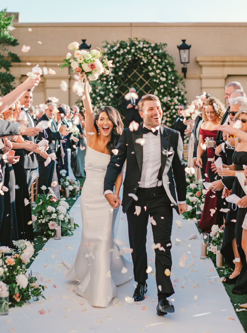 The bride selected a soft romantic palette of blush and cream blooms to lean into the garden-inspired ceremony design. The terrace at the St Regis boasts a beautiful stone platform that acted as the backdrop for the nuptials. We had a custom lattice arch designed to support the lush ceremony arbor that the couple exchanged vows under. Guests tossed petals as the couple recessed the aisle with joyful smiles.