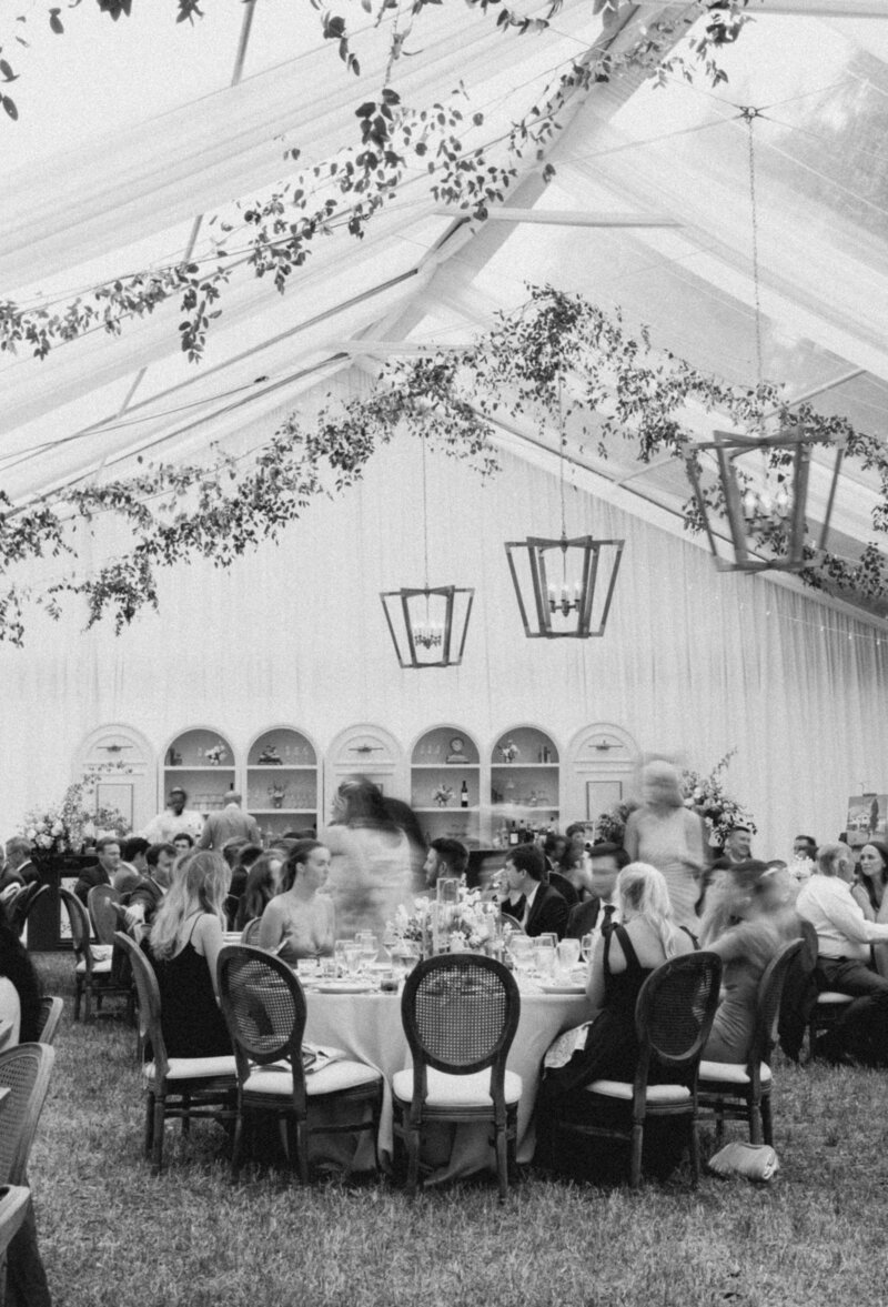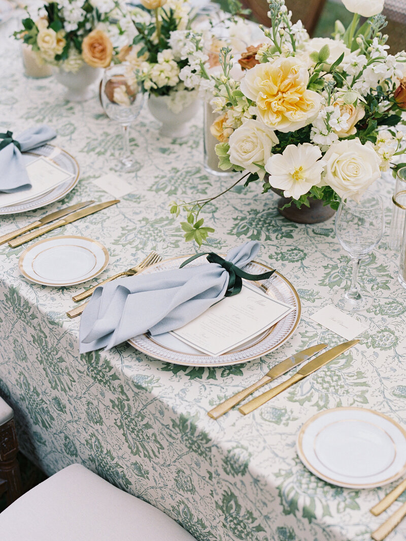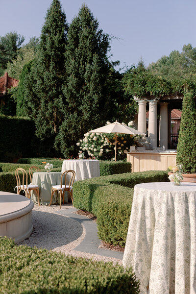 The reception tent was a show-stopper and included chic neutral draping with olive-green trim, wood and brass chandeliers mixed with romantic string lights dripping with delicate greenery. We leaned into the Italian style and incorporated a pattern on the reception bar and dance floor that was inspired by a Tuscan tile pattern. The tent design was completed with a combination of dusty blue, pale green, and patterned linens paired with wooden cane back chairs and soft earth-toned florals. The evening ended with a fireworks display along the waterfront that wowed everyone!