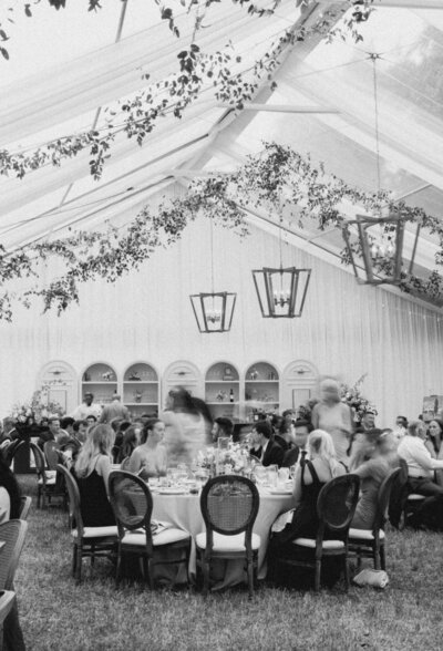 Dinner took place in the pavilion where we incorporated sheer off-white draping around the perimeter to create softness and a more intimate atmosphere while also allowing the natural light to filter in. Neutral garden-inspired table linens were adorned with juicy summer-toned florals that leaned into the season and were layered with delicate floral patterned dinnerware.