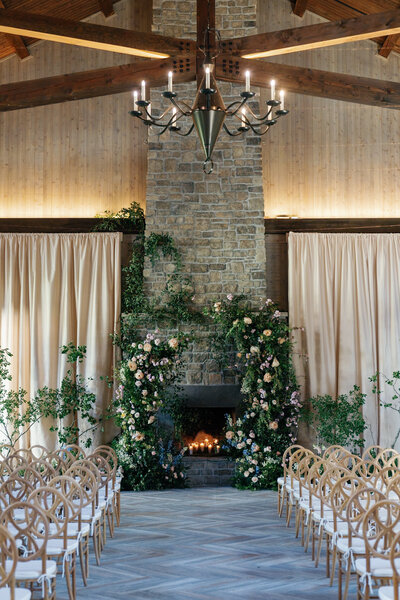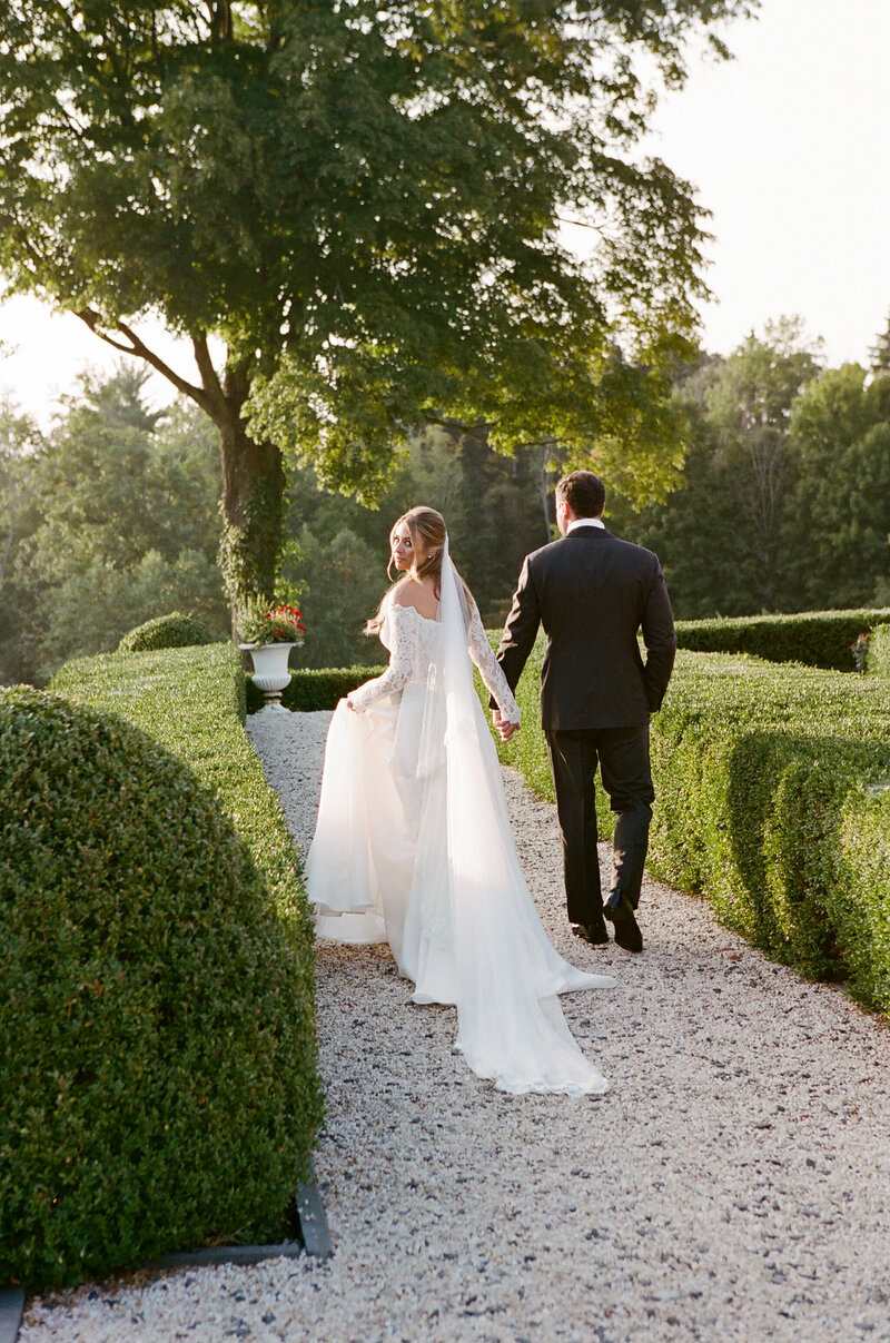 We worked with the couple to provide an effortless experience and unforgettable weekend for their guests. Friends and family staying off-property were shuttled in and greeted with champagne upon arrival at the remarkable entrance to the estate. Guests mingled through the manicured gardens down to the hillside ceremony lawn with a view overlooking Glenmere Lake. The couple was wed under the shade of the stately ceremony tree surrounded by lush florals.