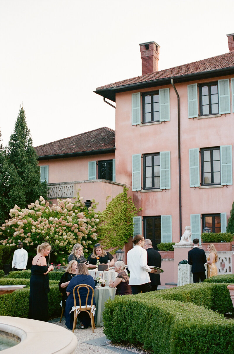 Guests meandered to the courtyard of the formal Italian gardens where they enjoyed a sublime grazing station, white-glove passed hors d’ouvres, and custom cocktails. A sketch artist was brought in to create one-of-a-kind illustrations for guests as keepsakes which they loved.